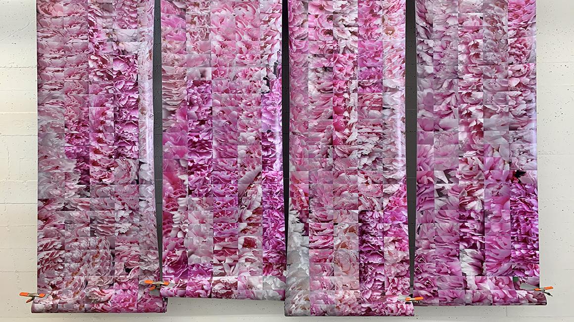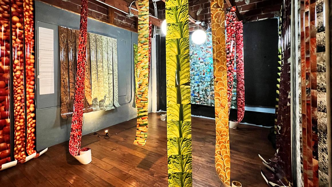 EAT ME, DRINK ME (2025). This installation explores the sensorial and conflicting experience of today’s food consumption and waste, at once seduction and repulsion. The title of the installation comes from Lewis Carroll’s Alice’s Adventures in Wonderland (1865), throughout which Alice is influenced by the objects around her, some which make her take particular actions, and others which physically transform her body, symbolizing temptation and transformation, control and loss of control. Each one of the works in this installation invites the viewer to reflect on the visual beauty and subliminal seductiveness of the foods we consume – even of the trash we collect. I find a striking graphic similarity between the rhythmic patterns of this imagery and that of the representations of many of our physiological systems. The goal of this immersive experience is to invite the viewer to imagine the mundane from a variety of perspectives, and to stimulate in the viewer a renewed awareness of the consequences of our choices.
